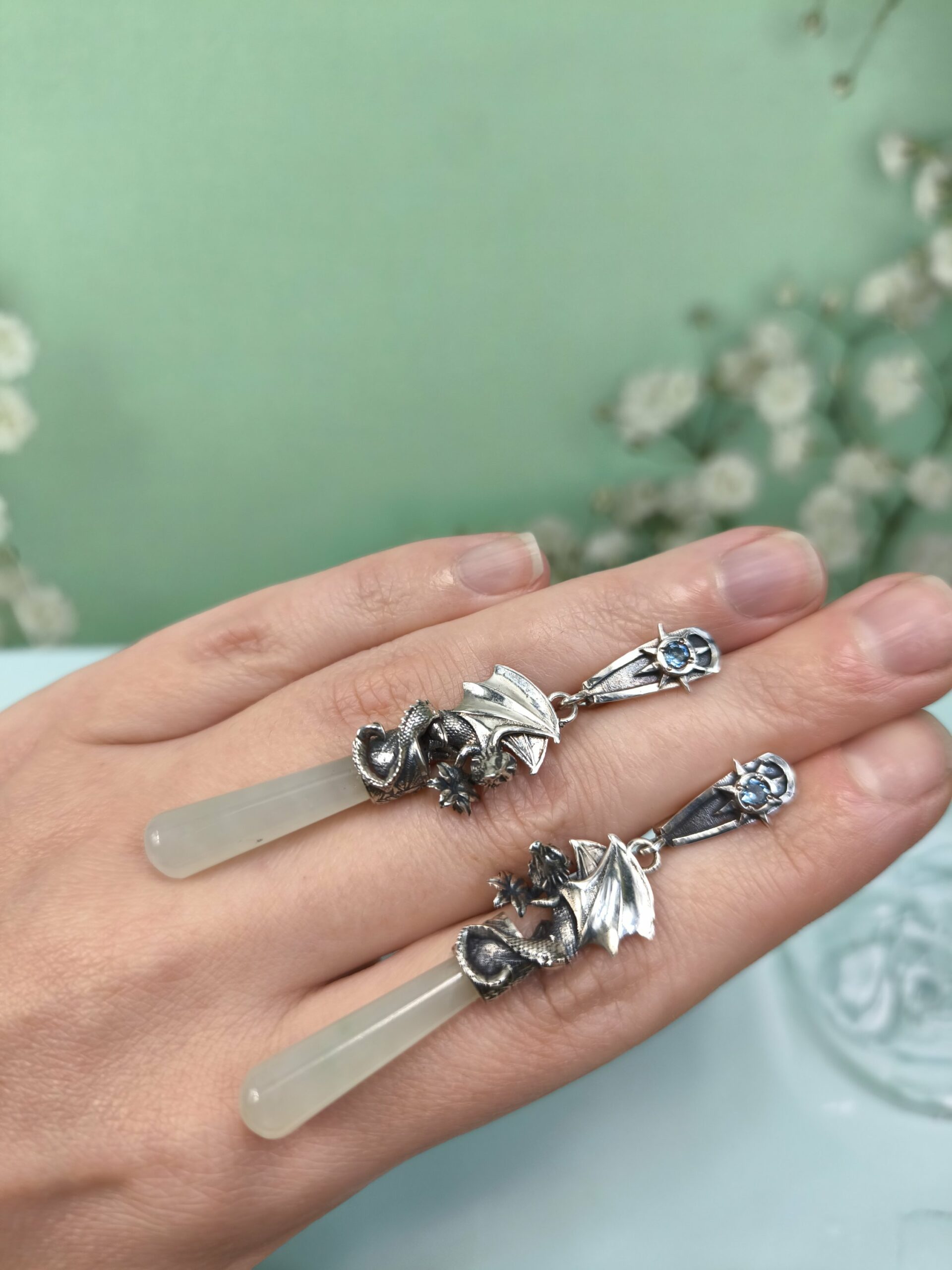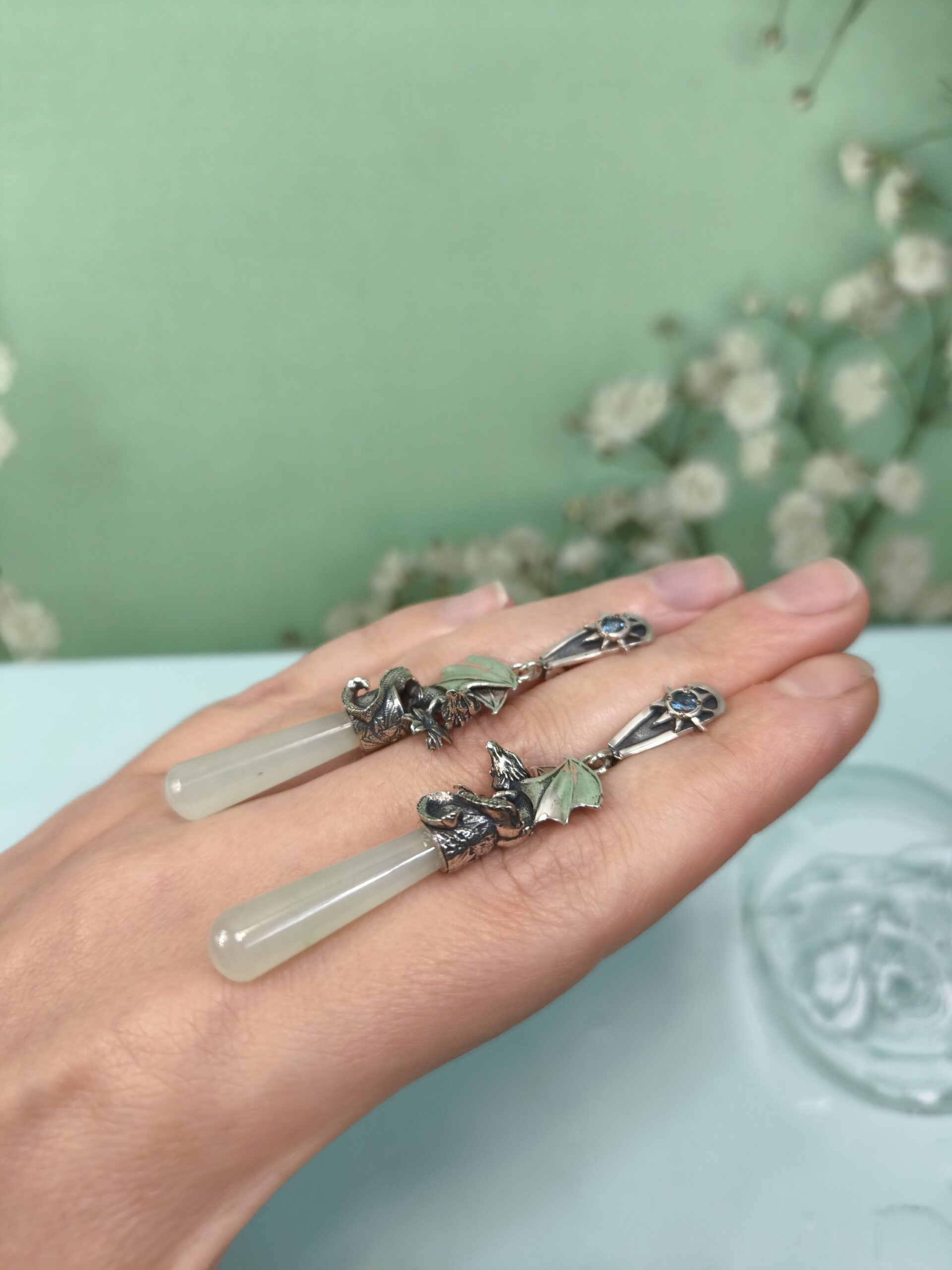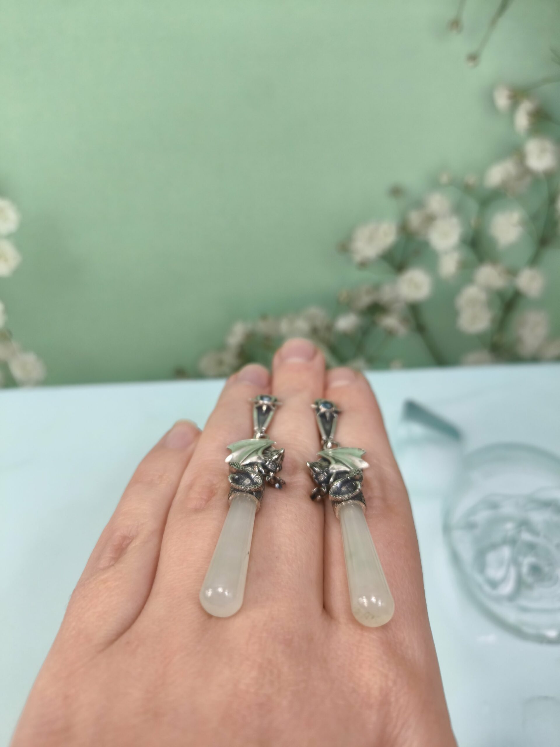 Драконы.Белый Нефрит и топазы. Вес одной серьги 8.50гр. Длина серьги 5.5см.