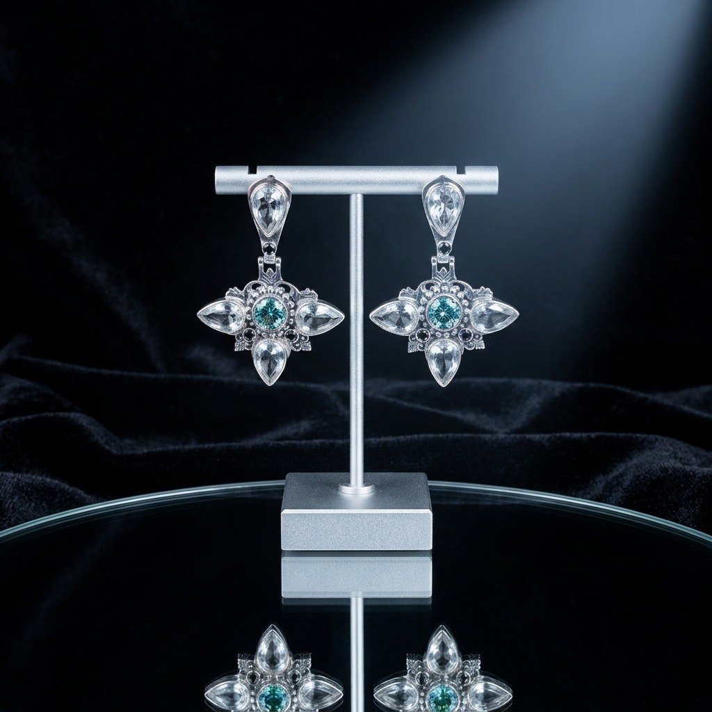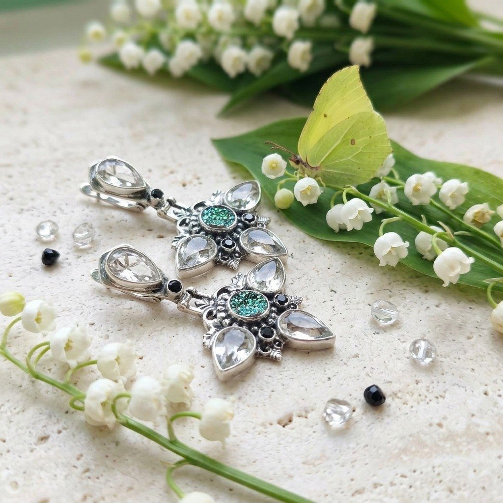 Хрусталь. Муассанит. Шпинель. Вес одной серьги 10.50гр. Длина серьги 5см. Размер муассанита 8мм.