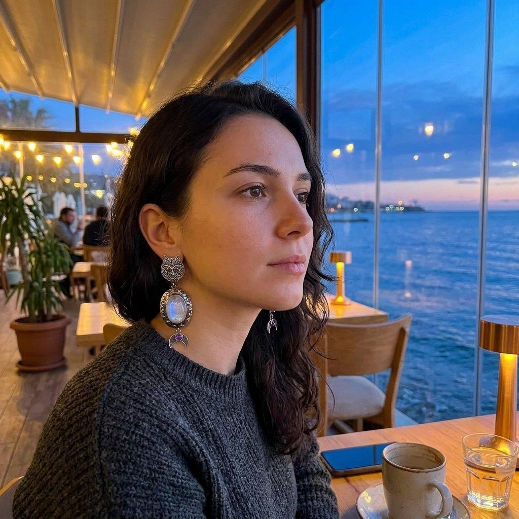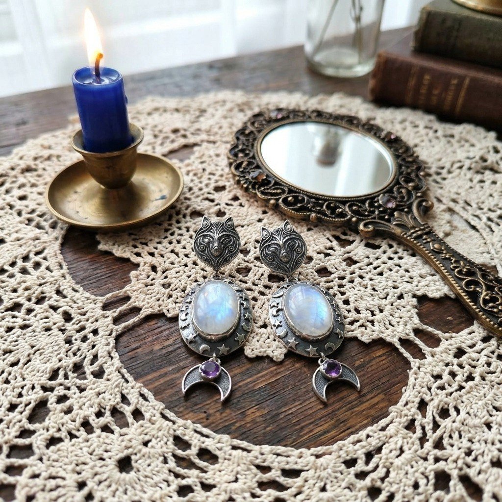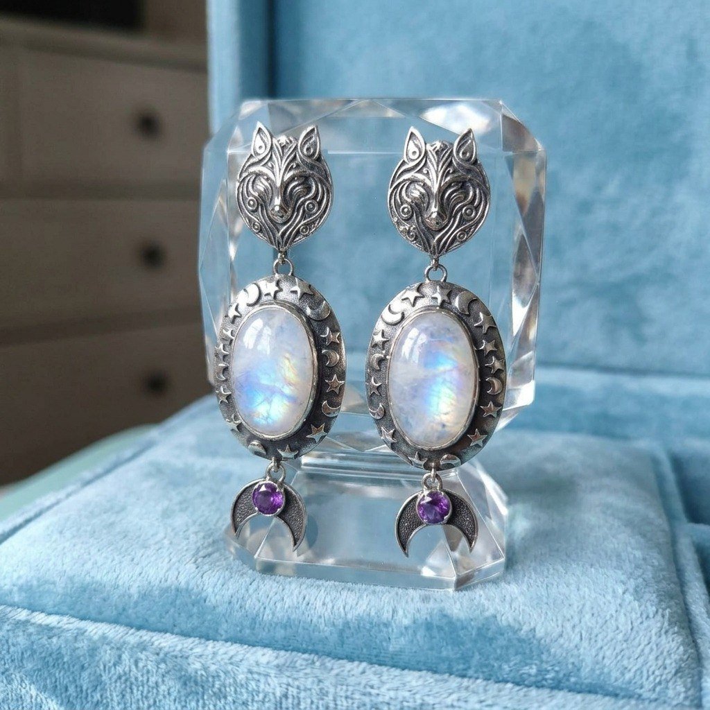 Лунный камень и аметист в огранке. Вес одной серьги 11.50гр. Длина серьги 6,3см.