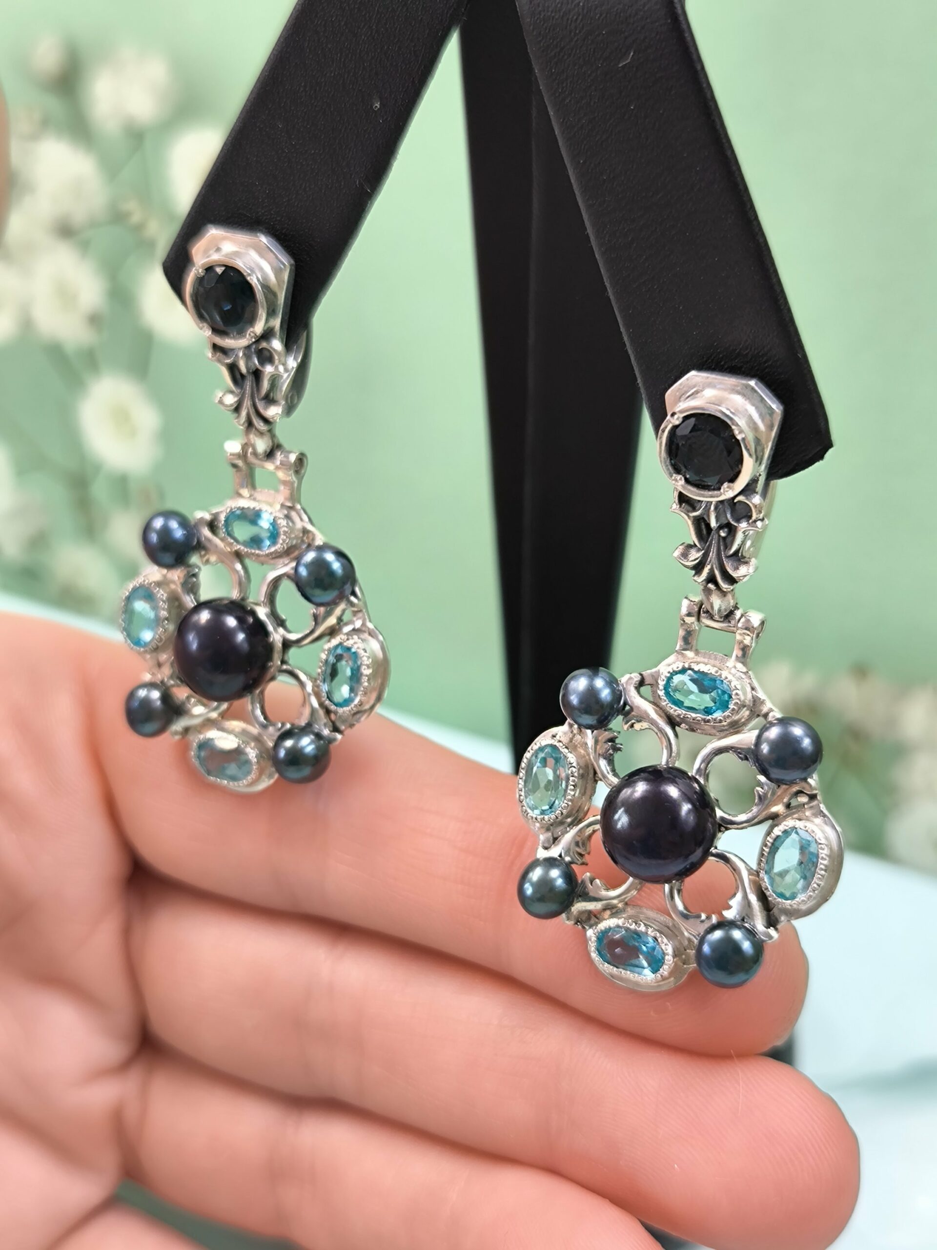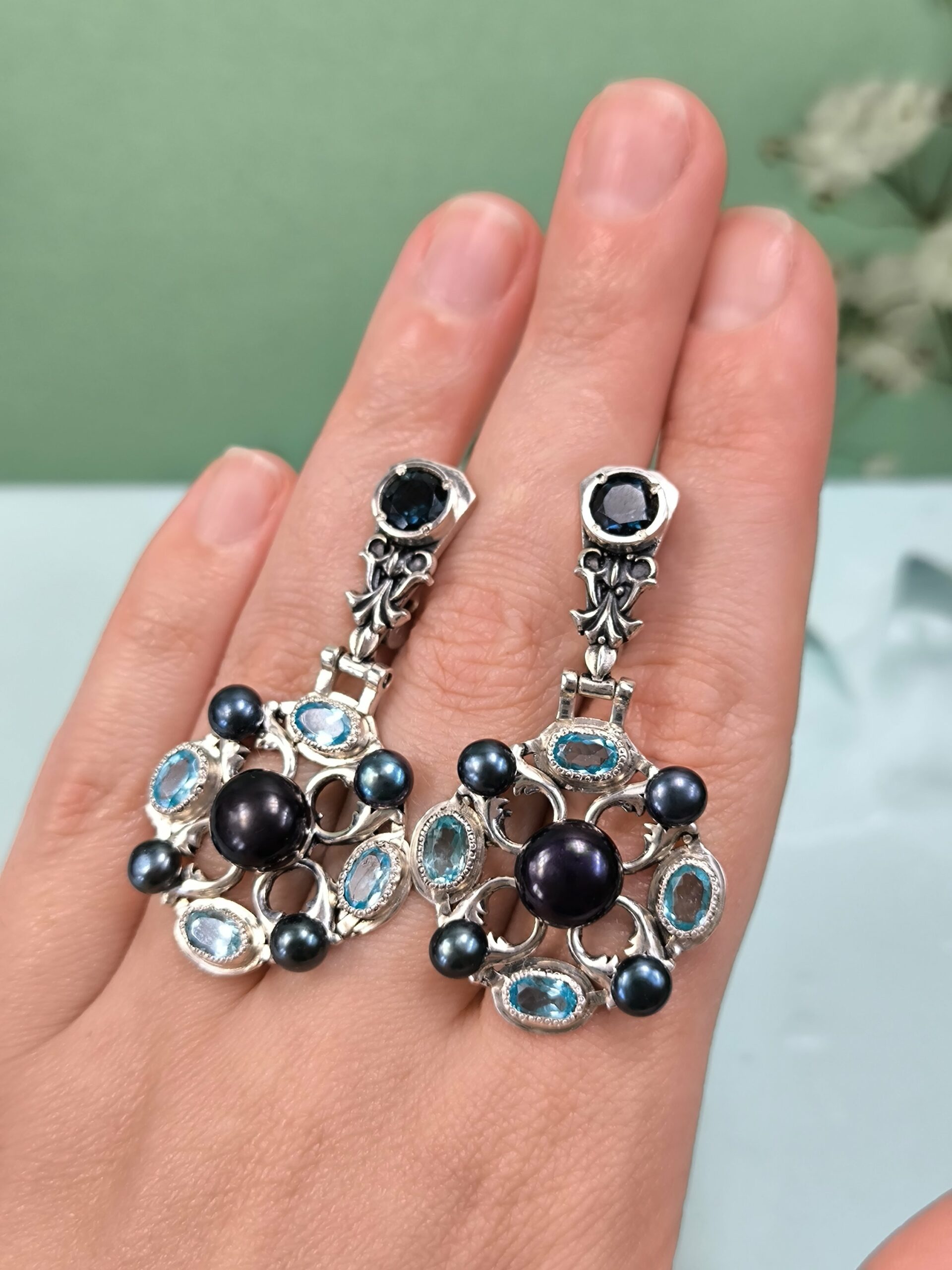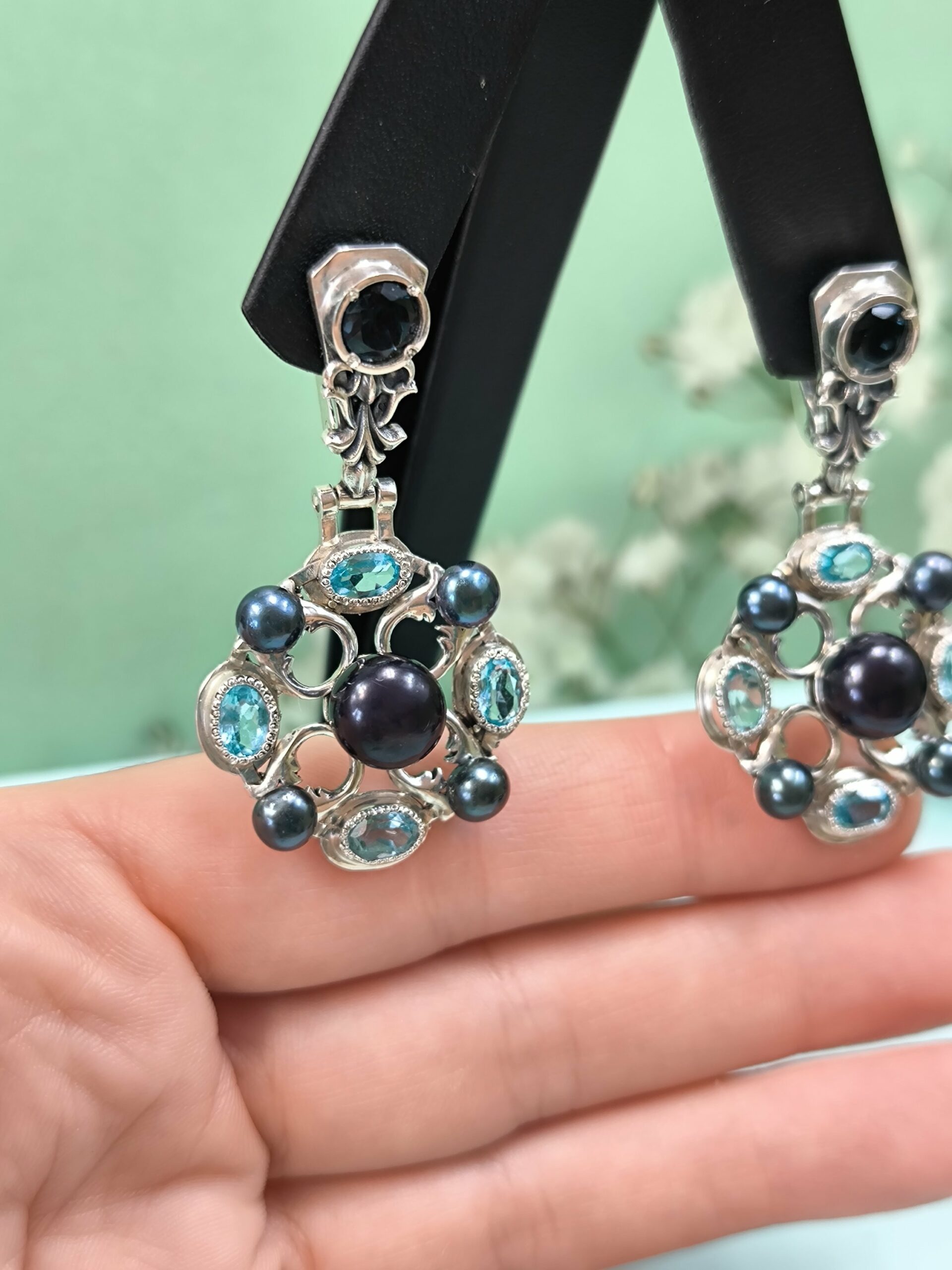 Жемчуг, кианит и Лондон топаз. Вес одной серьги 10гр. Длина серьги 5см